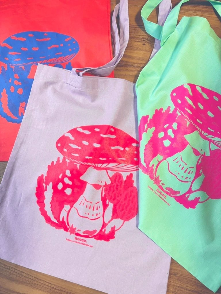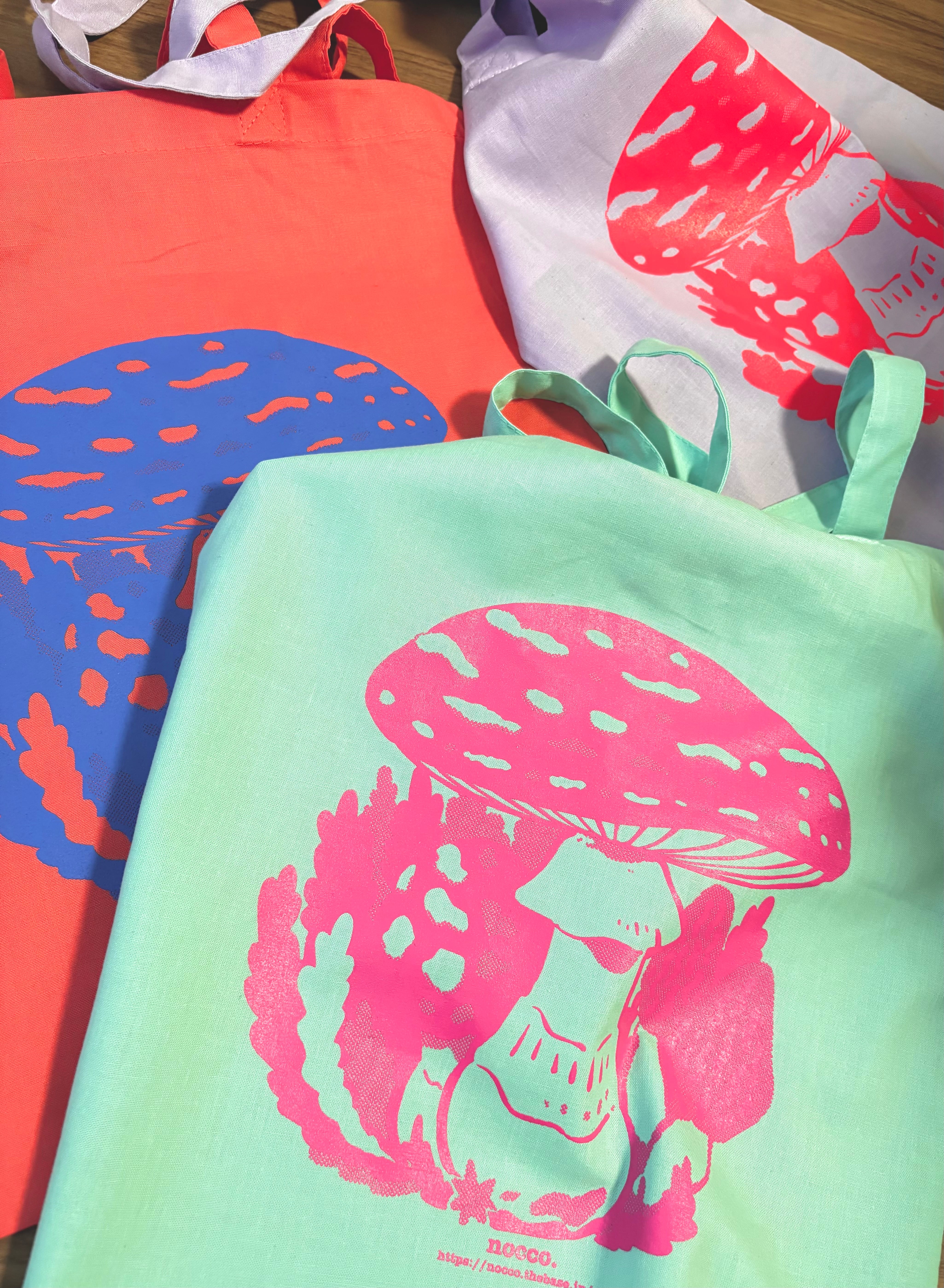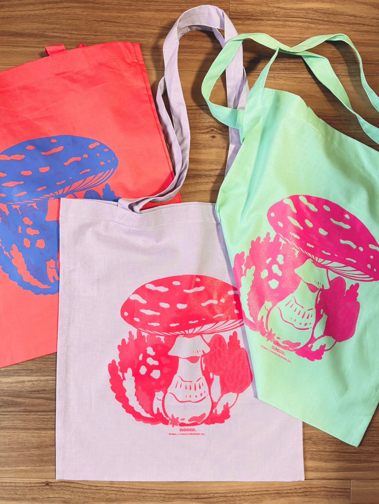 きのこプリントのフラットトートバッグです。