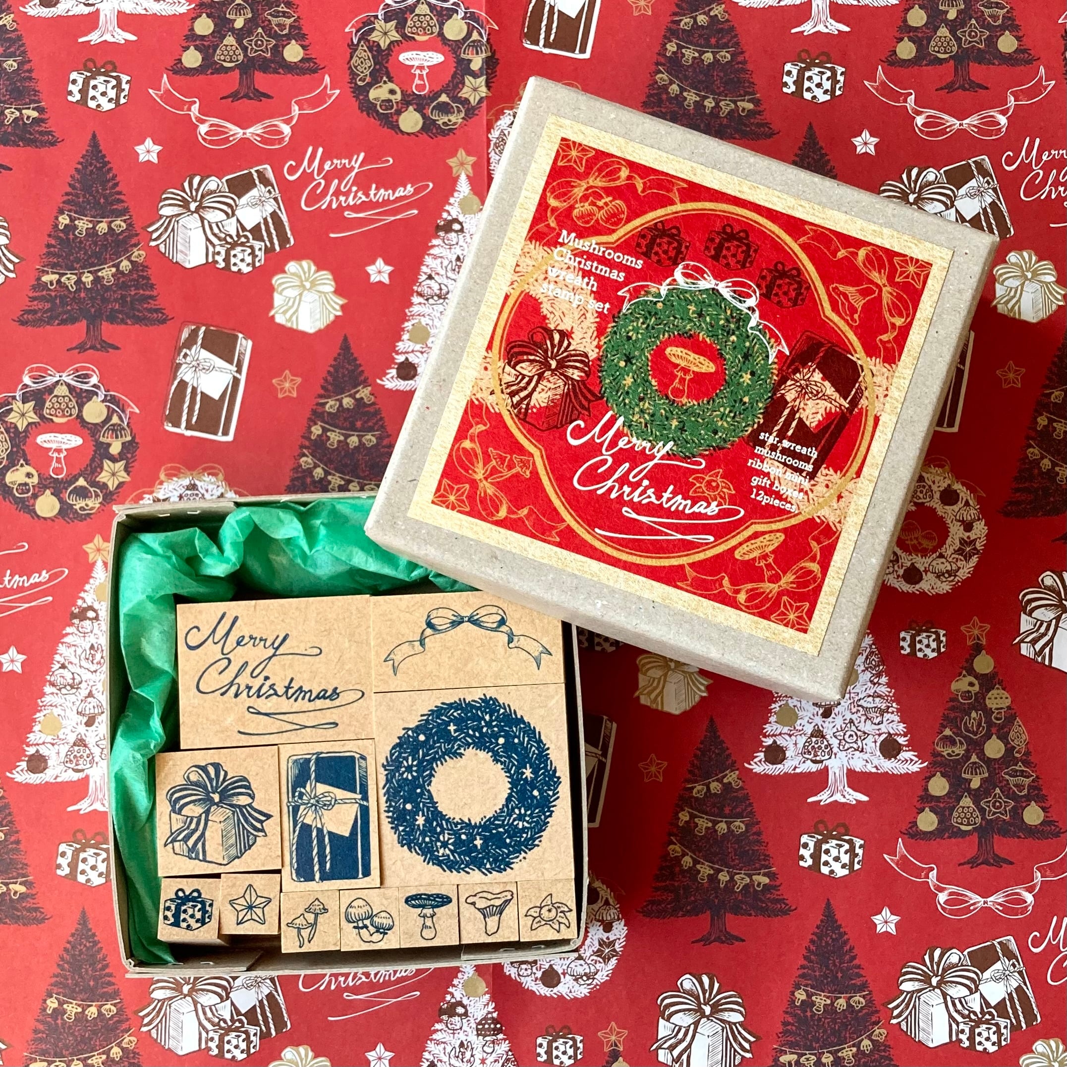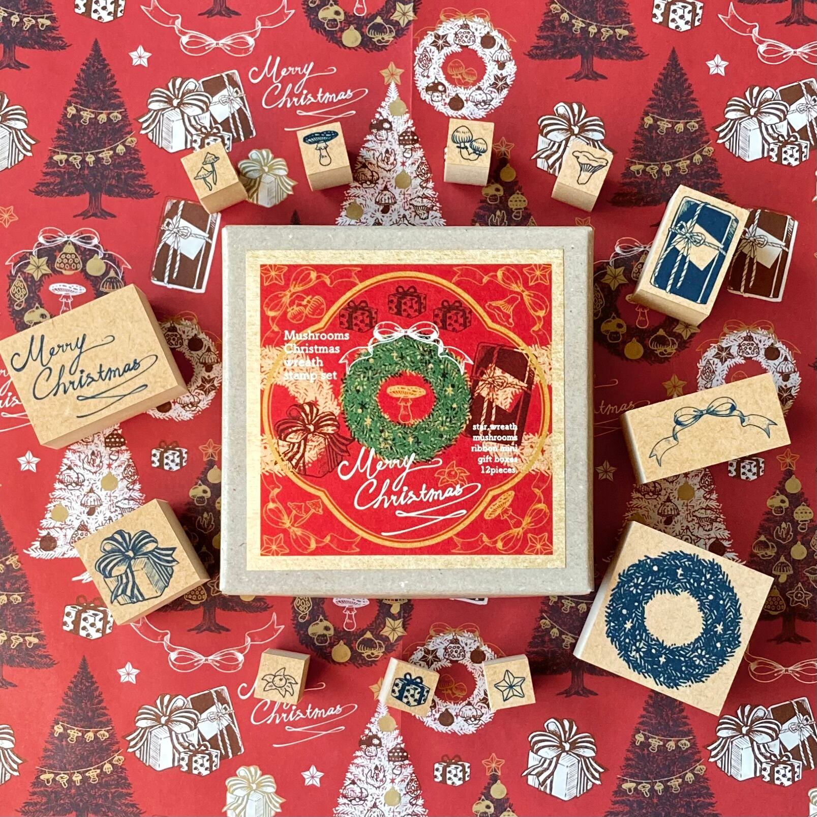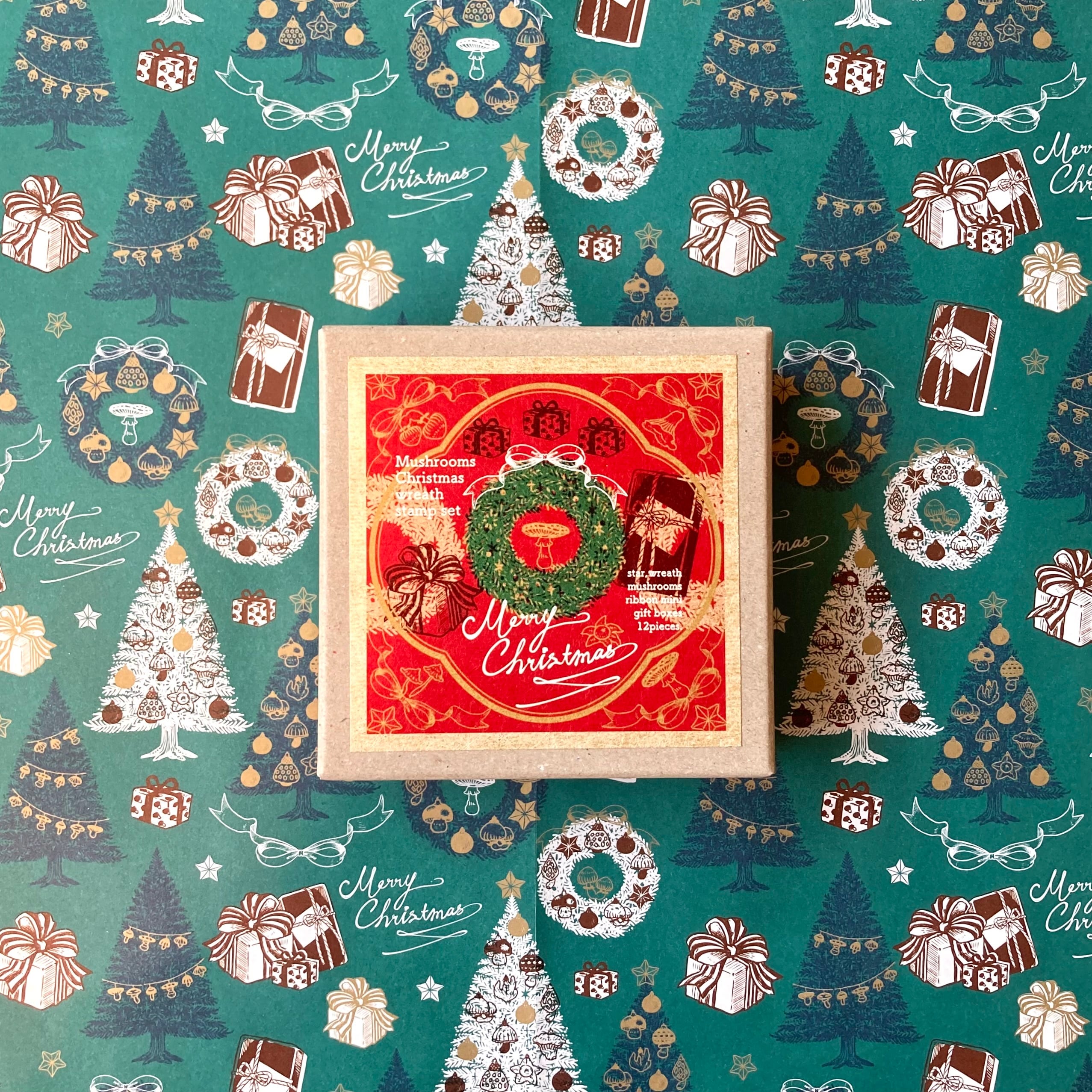 リースとミニきのこのマッシュルームクリスマスリーススタンプセットです。